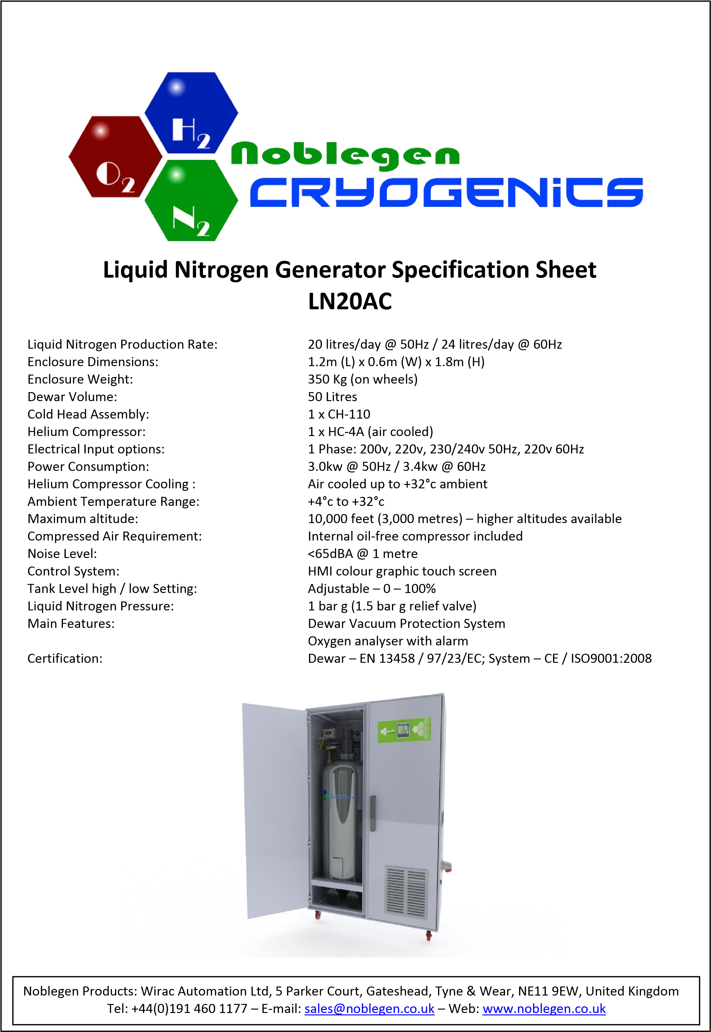 Liquid Nitrogen Production Rate: 20 litres/day @ 50Hz / 24 litres/day @ 60Hz
